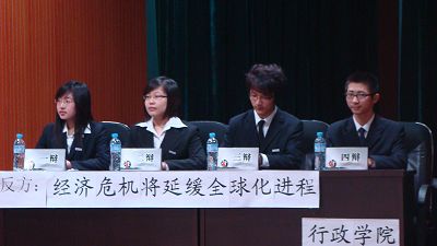 数学学院与我院对“经济危机将会加强还是延缓全球化进程”这一辩题展开了激烈的辩论。在整个比赛过程中,我院四位辩手保持我院一贯的辩风——沉着冷静,机智幽默。面对对手关于 “经济危机的爆发使各国认识到全球合作的重要性,从而加强合作与交流,促进全球化进程”的论述,我院辩手有理有据地维护我方观点——在经济危机的大背景下,各国转投国内企业,为经济的发展提供缓冲的平台,从而在危机时期会延缓全球化进程。